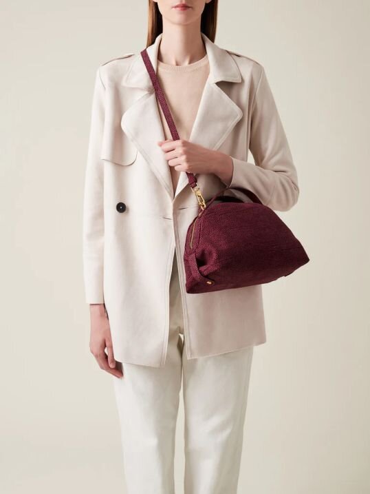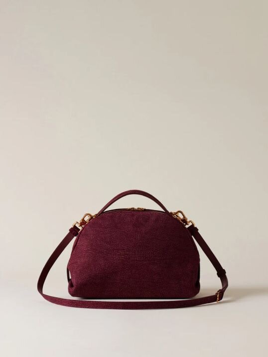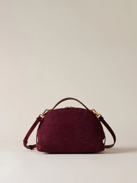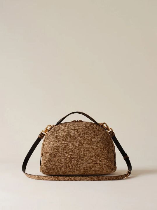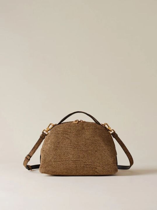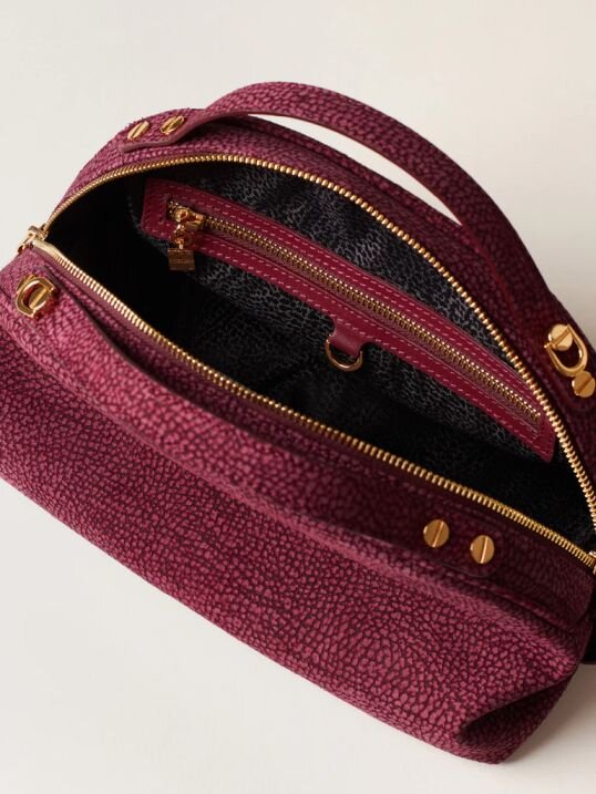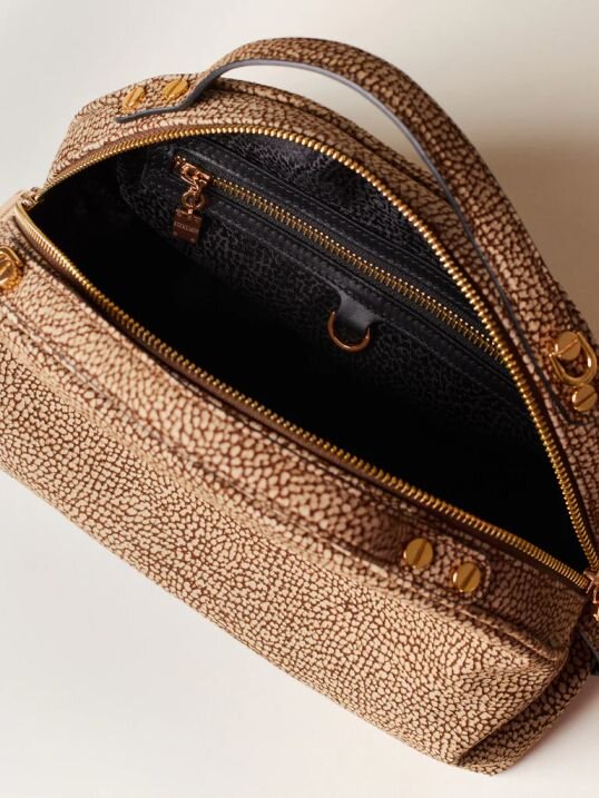 Camoscio OP, chiusura a zip a doppio cursore con placchetta logata e vite, tracolla di regolabile e removibile, interno con tasca a zip e tasca aperta, fodera di tessuto riciclato, metallerie Oro e misura Small.
