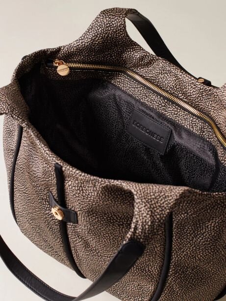 Tessuto riciclato stampa Op, dettagli in pelle e profili in nylon unito, fodera di tessuto jacquard riciclato, chiusura con patta con magnete, una tasca interna chiusa con zip in metallo con tirazip che riprende la vite logata, metallerie oro chiaro e misura medium.