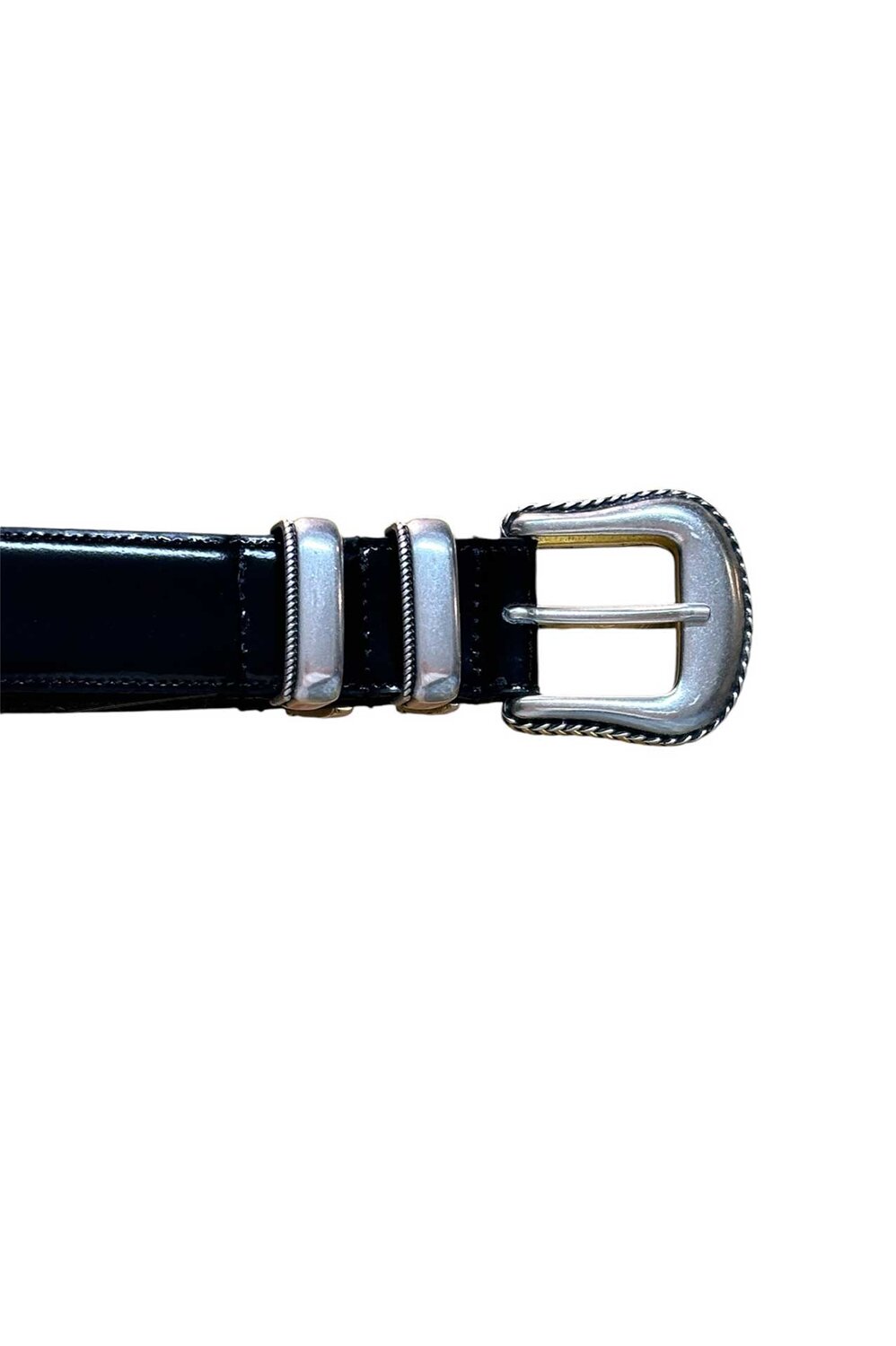 Cintura in pelle lucida con dettagli acciaio satinato color argento.