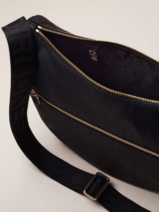 Tessuto riciclato stampa op, dettagli di pelle, chiusura regolata da zip, tasca esterna con zip, tirazip a forma di vite, simbolo del brand. tracolla regolabile di nastro logato, interno foderato, tre tasche interne di cui una con zip, metallerie oro chiaro e misura middle.