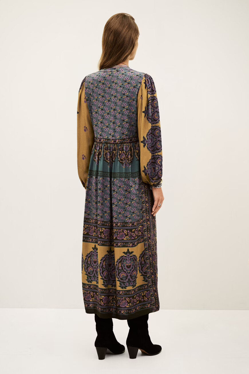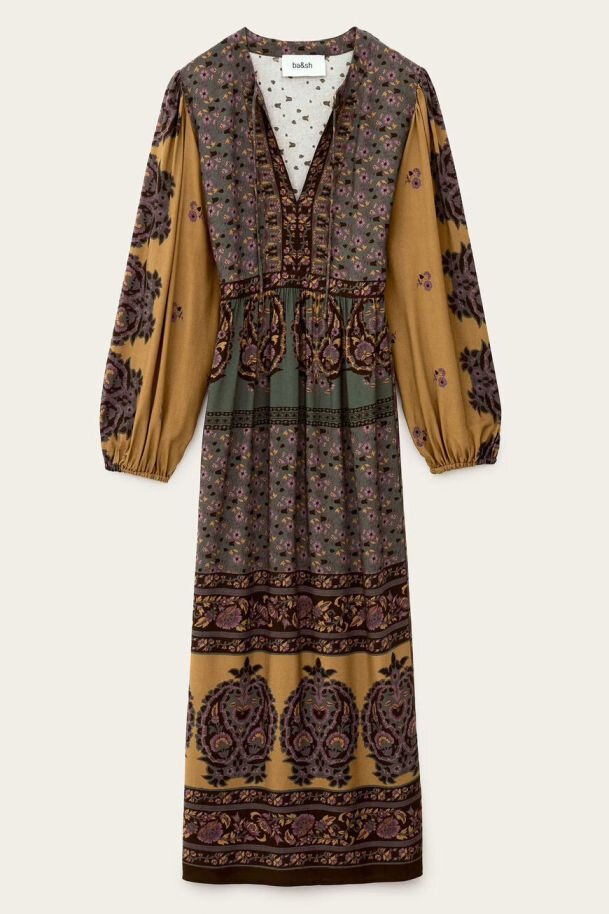 Taglio midi, maniche lunghe, cintura senza piega in vita, stampa floreale, ispirazione anni '70.