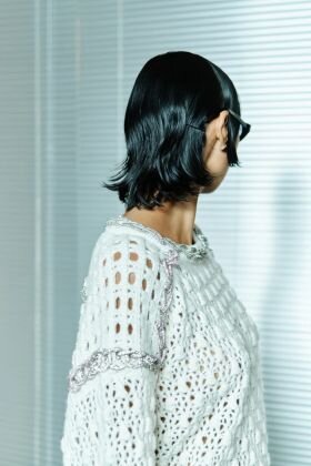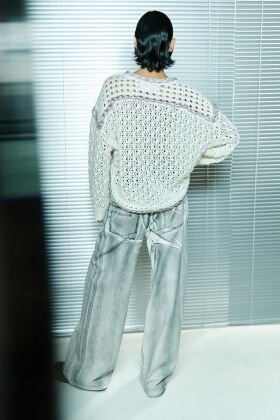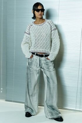 Maglia girocollo a uncinetto con dettagli cordoncino strass a catena, fondo asimmetrico fronte e retro, spalla scesa e vestibilità ampia.