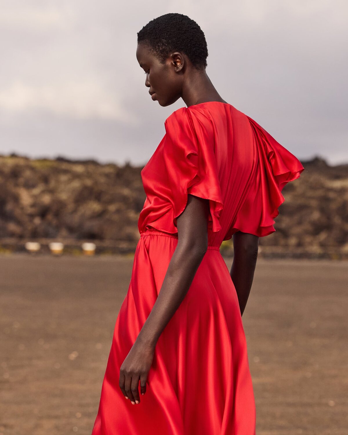 Un soffio di leggerezza ed eleganza definisce il nostro abito lungo in raso, che rivela una silhouette eterea esaltata da un drappeggio fluido e da una delicata lucentezza. La scollatura incrociata incornicia magnificamente il viso, mentre le maniche a farfalla aggiungono un tocco di romanticismo. La vita definita accentua la figura prima di sfociare in una gonna ampia con orlo asimmetrico. Un modello raffinato, perfetto per un'occasione speciale o per illuminare la vita di tutti i giorni.