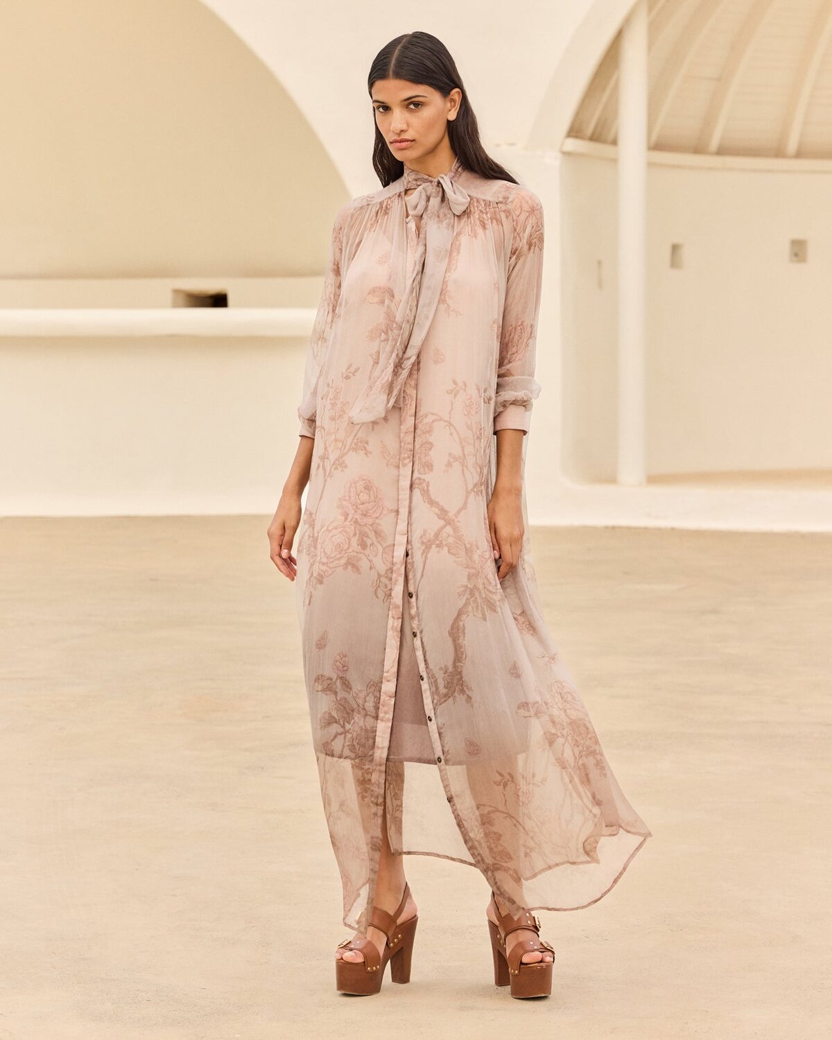 Questo fluido abito-camicia rosa cipria in chiffon di viscosa trasparente incarna un'eleganza eterea e romantica. La sua delicata stampa floreale, impreziosita da una delicata sfumatura tie-dye sull'orlo, gli conferisce un fascino poetico e raffinato. Il colletto lavallière aggiunge un tocco femminile e sofisticato, mentre la fodera separata in cotone tie-dye offre comfort e un delicato contrasto. Le maniche lunghe leggermente trasparenti e il taglio ampio e fluido valorizzano delicatamente la figura. Indossalo con una cintura per accentuare il punto vita o lasciato svolazzante per un effetto bohémien-chic.