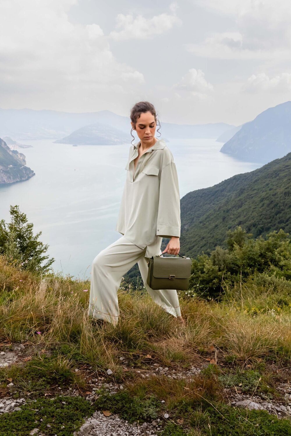 Borsa media con manico fisso, chiusura con logo, doppio vano interno di cui uno con cerniera, tasca interna con zip, tracolla in pelle rimovibile e regolabile max cm.115.