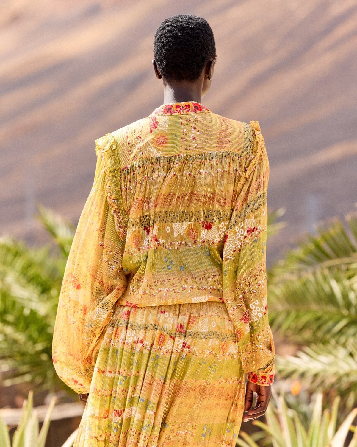 Una raffinata camicia in chiffon di viscosa impreziosita da scintillanti fili di lurex che conferiscono una delicata brillantezza al tessuto. Presenta delicati volant sulle spalle, ricami colorati su colletto e polsini e maniche lunghe e fluide che creano una silhouette ariosa. Si chiude con piccoli bottoni in madreperla sul davanti. Abbinala alla gonna "Kaligari" per un completo poetico e luminoso.