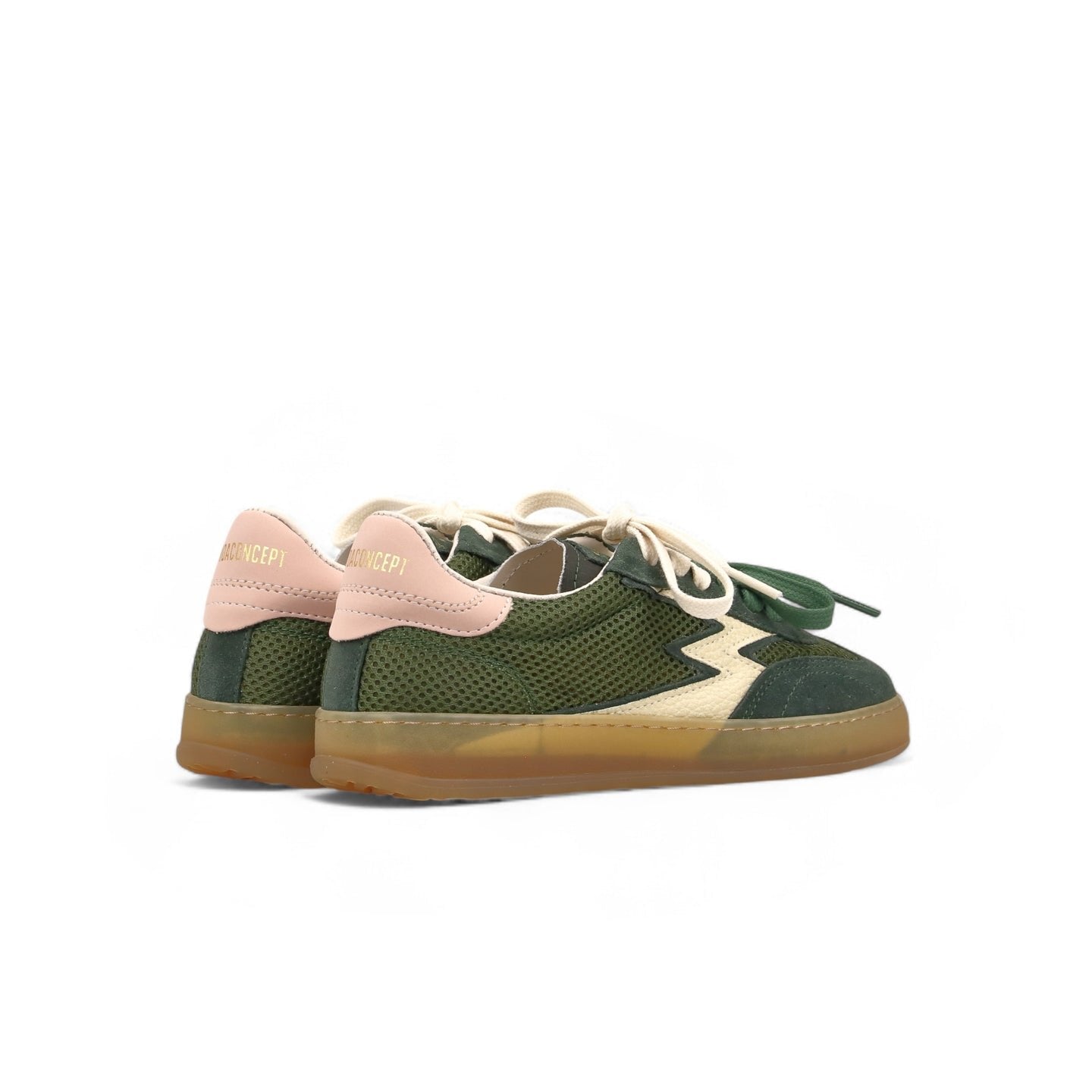 Sneaker da donna basse verde bosco made in Italy in mesh, con dettagli in suede, logo in pelle martellata off white e backtab in pelle rosa confetto.