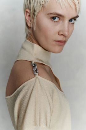 Maglia in filato lamè con collo a lupetto, dettaglio cut out su spalla con gioiello catenella strass, vestibilità comoda, spalla scesa e lunghezza al bacino.