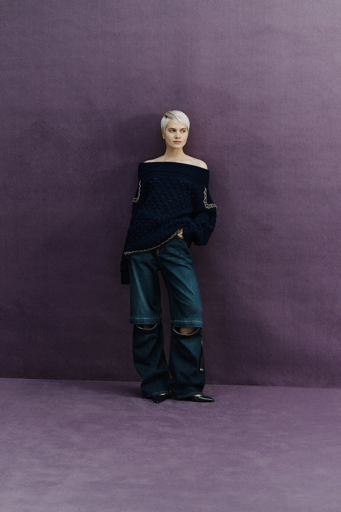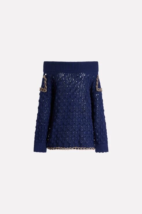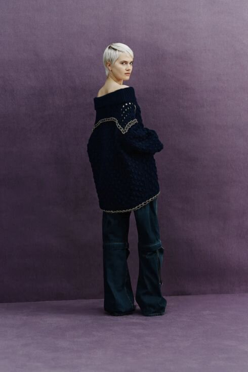 Maglia a collo alto a uncinetto in 100% lana con dettagli cordoncino strass a catene, maniche dolman, vestibilità oversize e lunghezza al bacino.