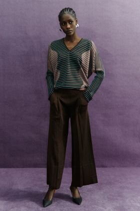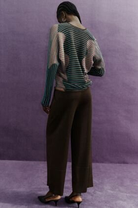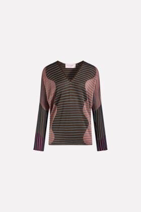 Maglia scollo a V con disegno jaquard waves in filo lamè, maniche dolman, vestibilità ampia e lunghezza al bacino.