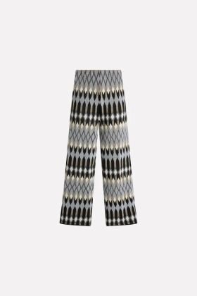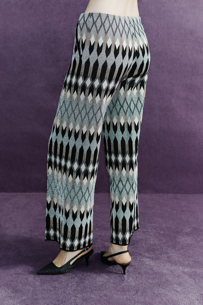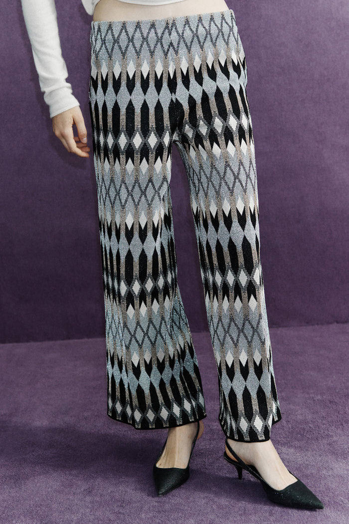 Pantalone modello cropped con disegno jaquard lamè geometrico, vita media ed elastico in vita.