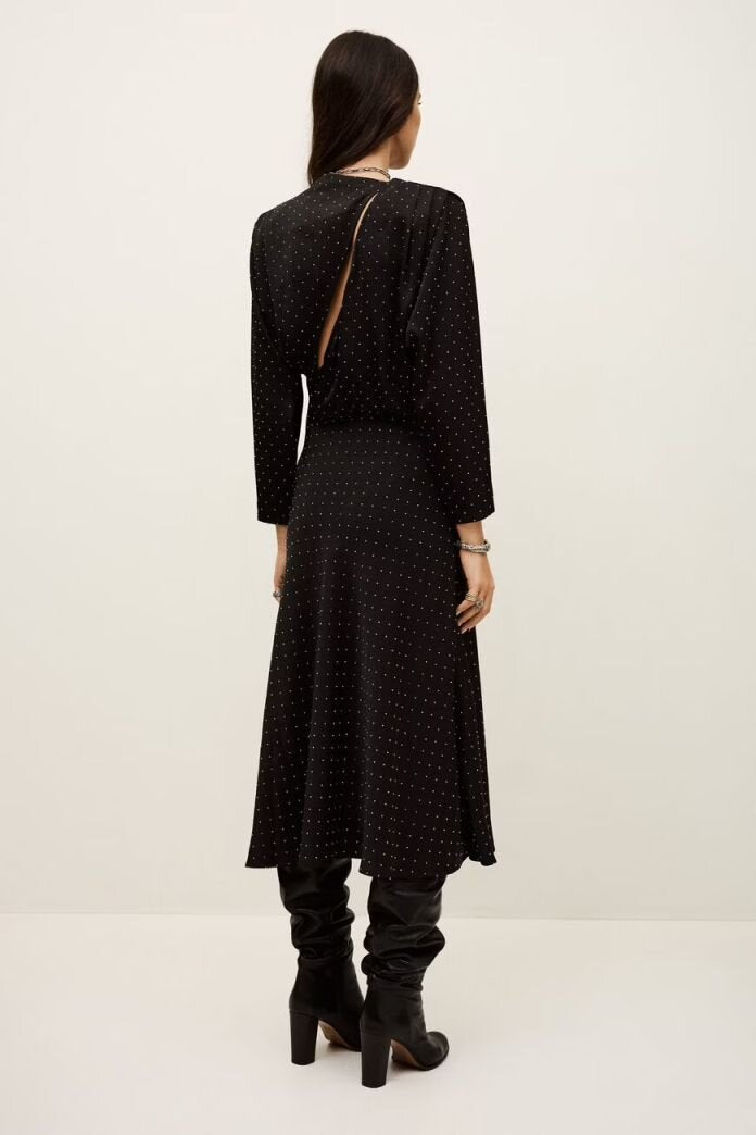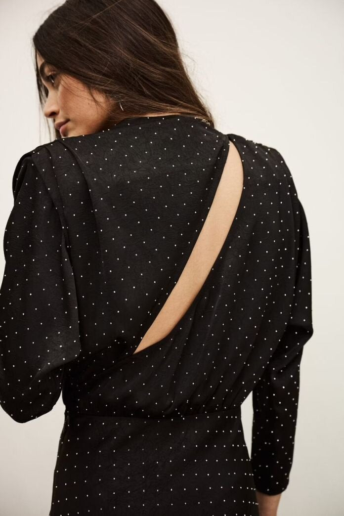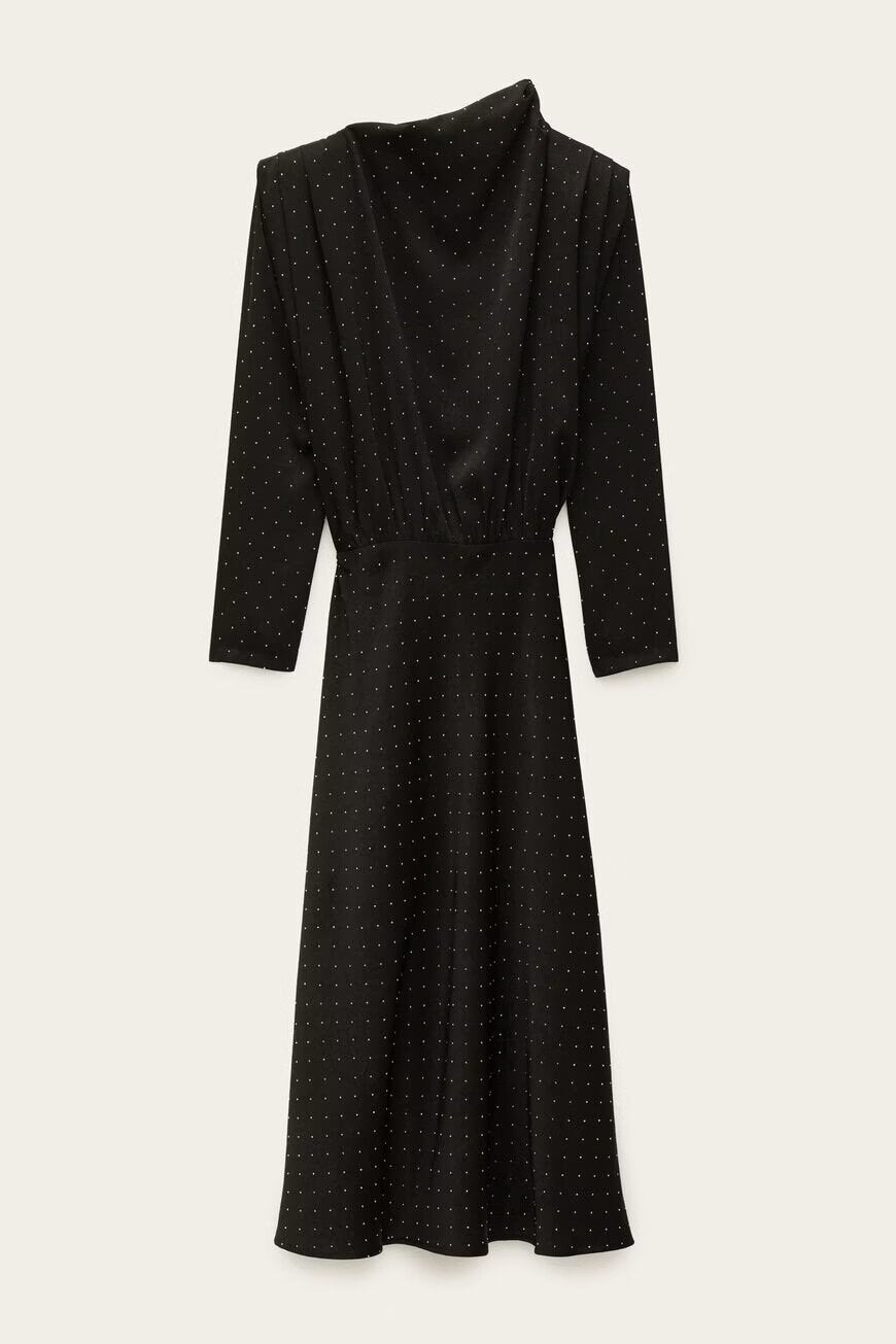 Abito da sera, maniche a pipistrello, colletto asimmetrico con pieghe, spacco sul retro e dettagli pieghe sulla gonna.