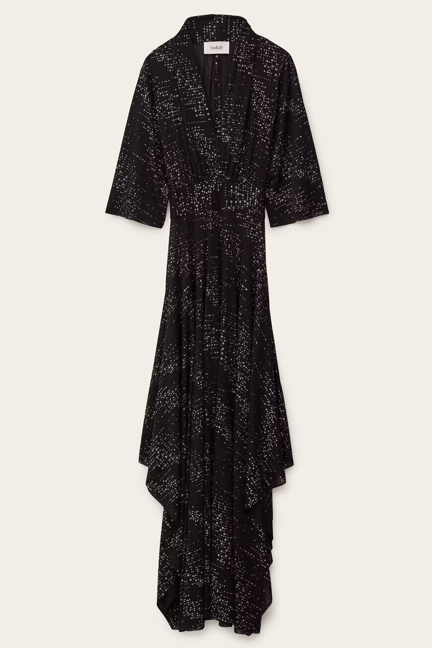 Maglia leggermente a coste, dettaglio di paillettes, dettaglio ritagliato sulla sezione della gonna, taglio ampio e fluido, ritagli originali sulla sezione della gonna, modello aperto lateralmente, scollatura a V profonda, cintura che segna la vita e maniche corte in stile kimono.