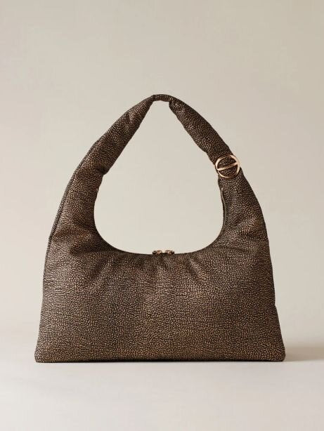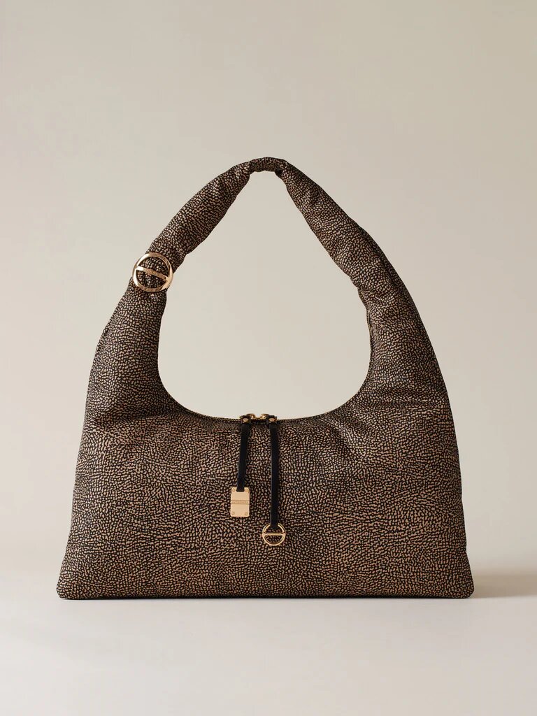 Tessuto riciclato stampato Op, fodera di tessuto jacquard riciclato, chiusura esterna con zip metallo e doppio cursore, tirazip in pelle con elementi Decorativi a vite e placchetta logati, due scomparti interni aperti, una tasca interna aperta, metallerie oro chiaro e misura large.