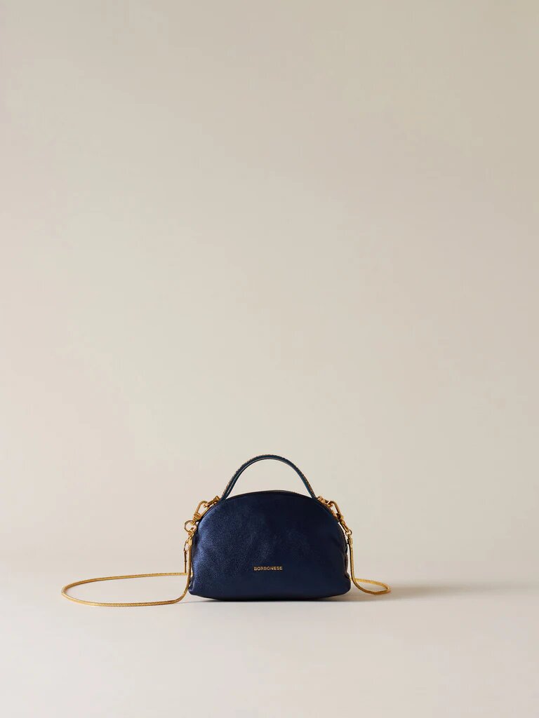 Pelle laminata, chiusura con zip e placchetta logata, tracolla di metallo removibile, una taschina interna aperta, fodera di tessuto riciclato, metallerie Oro e misura Mini.