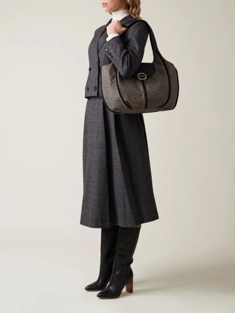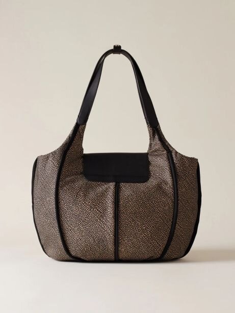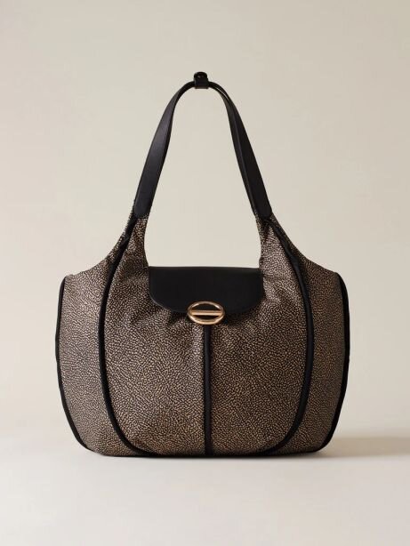 Tessuto riciclato stampa Op, dettagli in pelle e profili in nylon unito, fodera di tessuto jacquard riciclato, chiusura con patta con magnete, una tasca interna chiusa con zip in metallo con tirazip che riprende la vite logata, metallerie oro chiaro e misura medium.