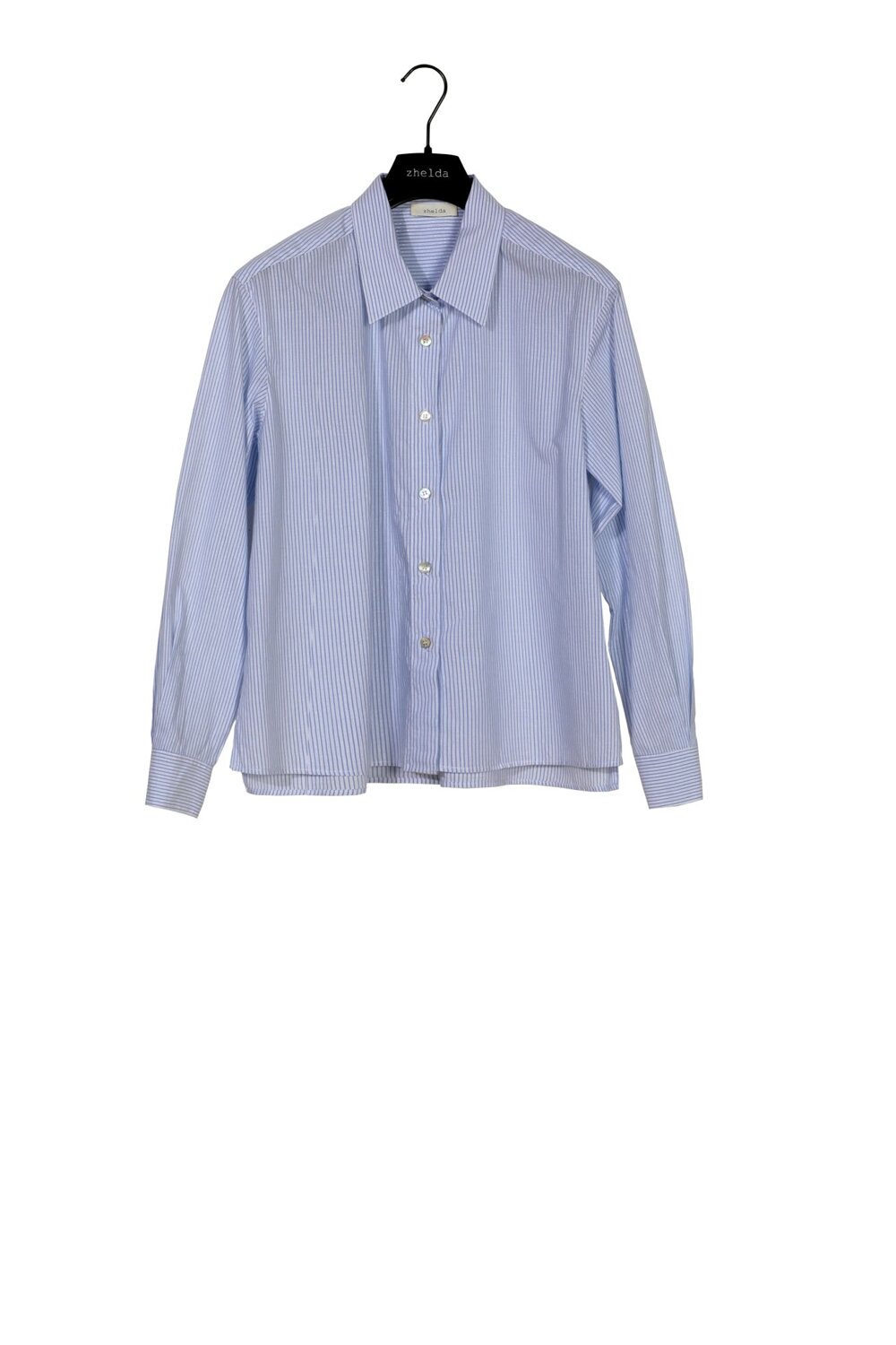Camicia a righe azzurre e lurex, chiusura con bottoni e fit strutturato.