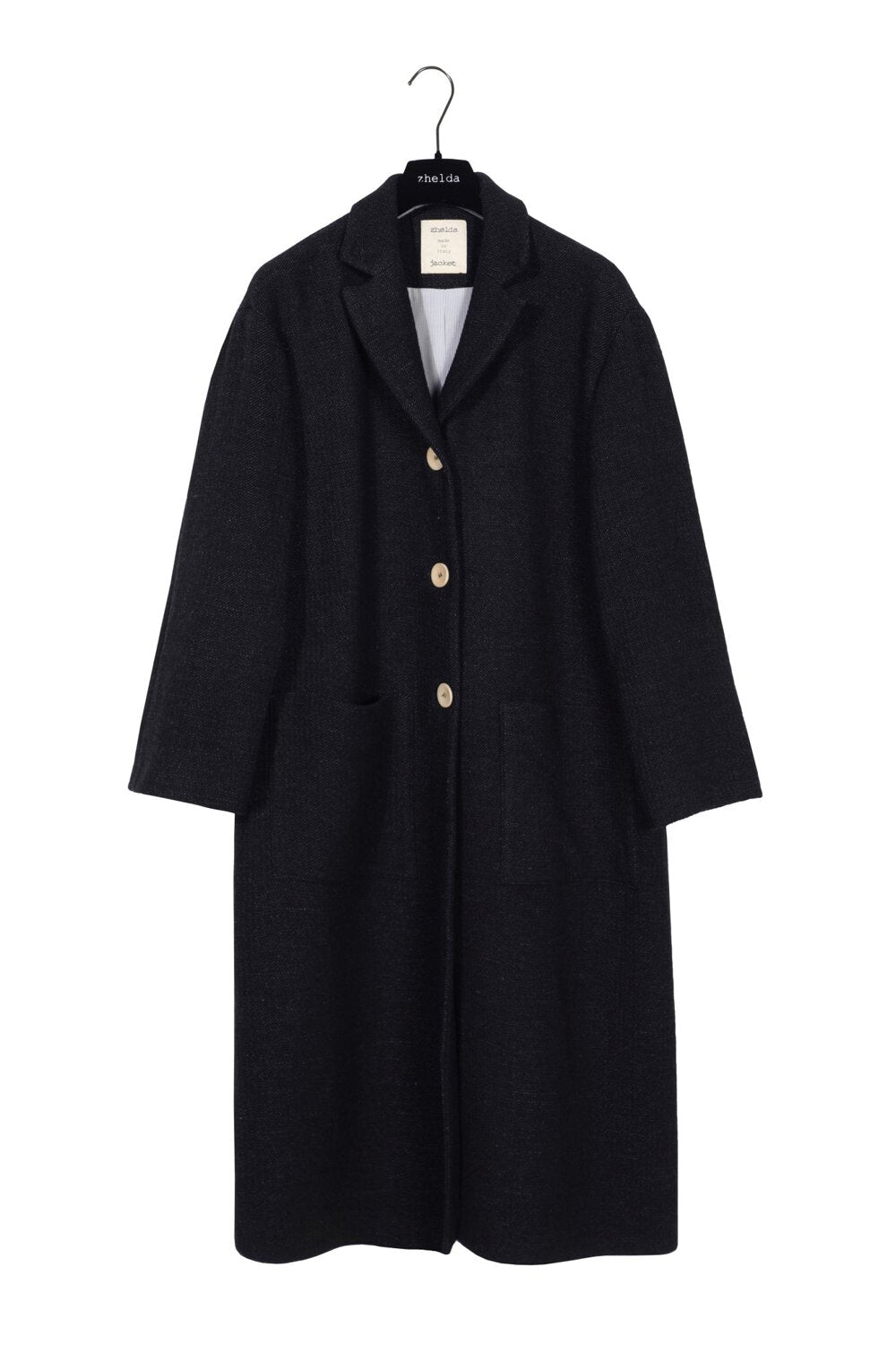 Cappotto lunghezza media con chiusura con bottoni, foderato all'interno e con deu tasche frontali.