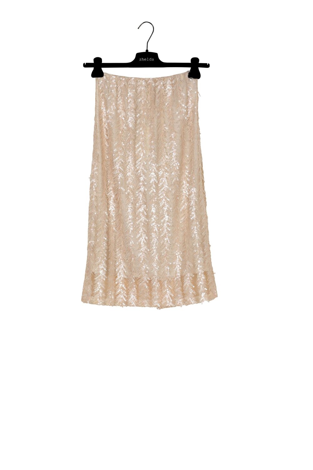 Gonna midi con sotto gonna, elastico in vita e applicazione di frange e pailettes.