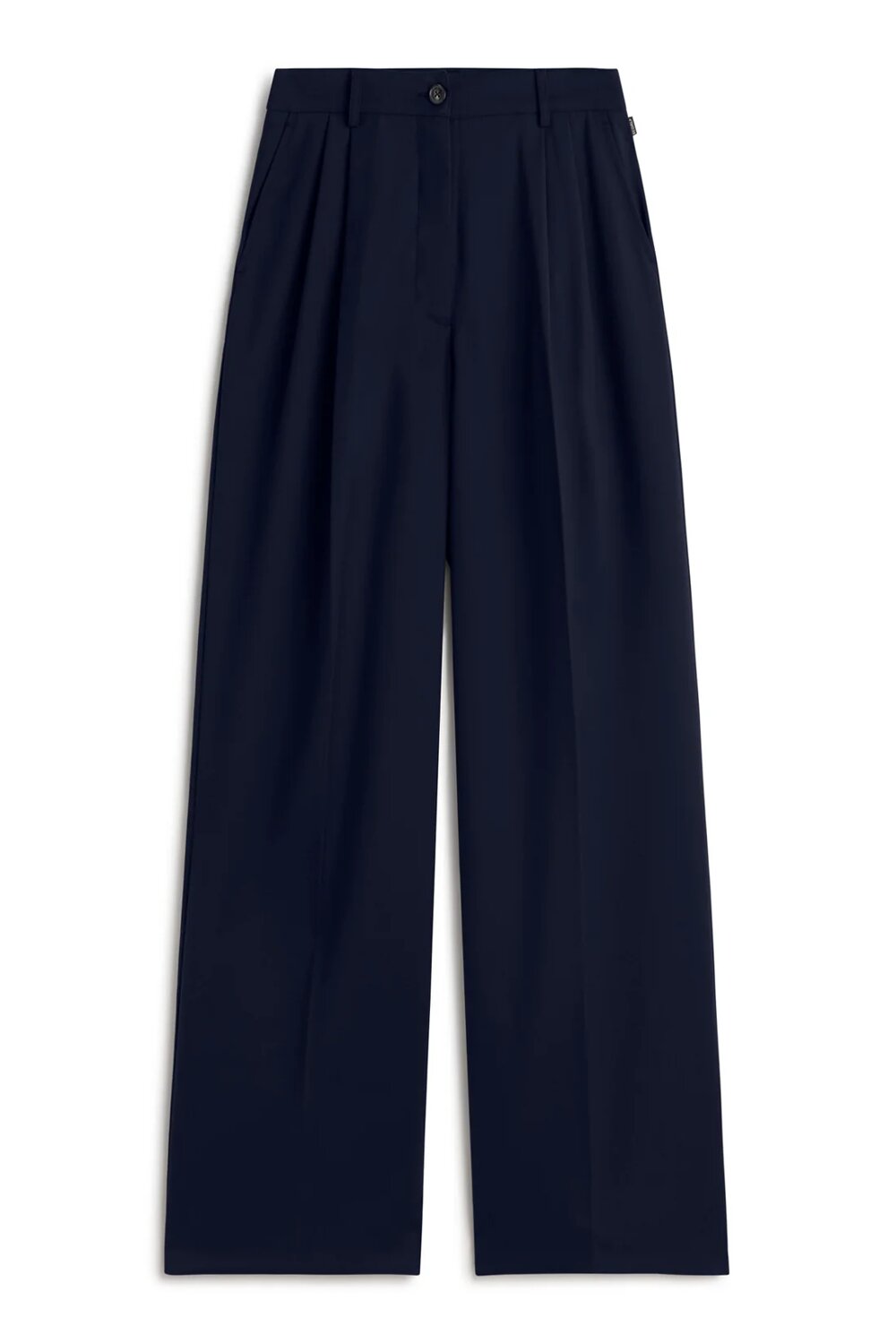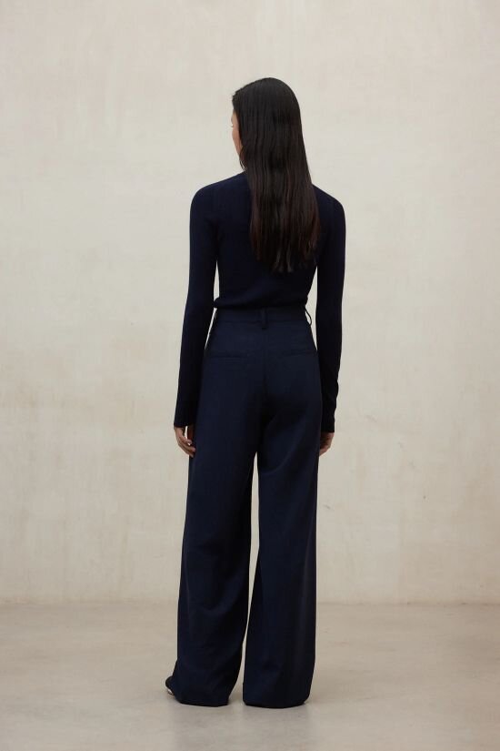 Vita alta, pieghe sul davanti, tasche alla francese, finte tasche con occhiello nella parte posteriore, passanti per cintura, chiusura con cerniera, chiusura con bottone in vita, dettagli con marchio.