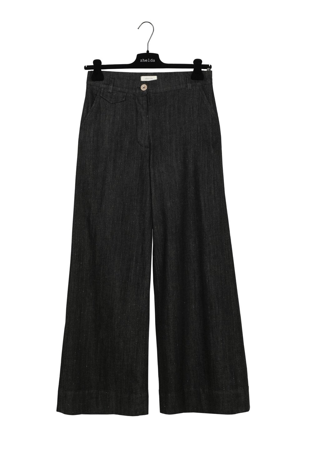 Pantalone ampio con chiusura a zip e bottone, passanti per la cintura, due tasche laterali e applicazione di glitter lungo le gambe.
