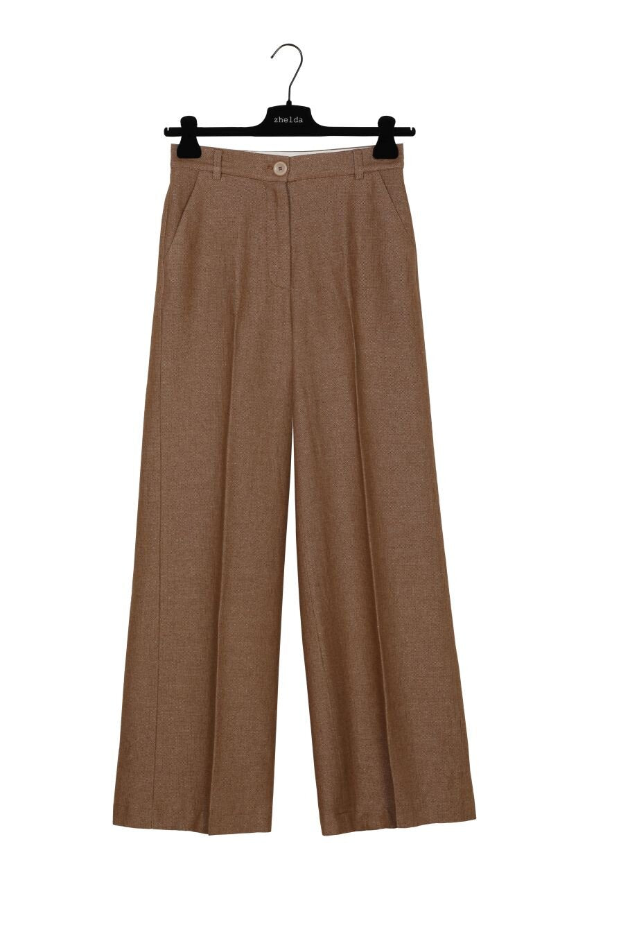 Pantalone a gamba larga, con chiusura con zip e bottone, passanti per la cintura e deu tasce laterali.